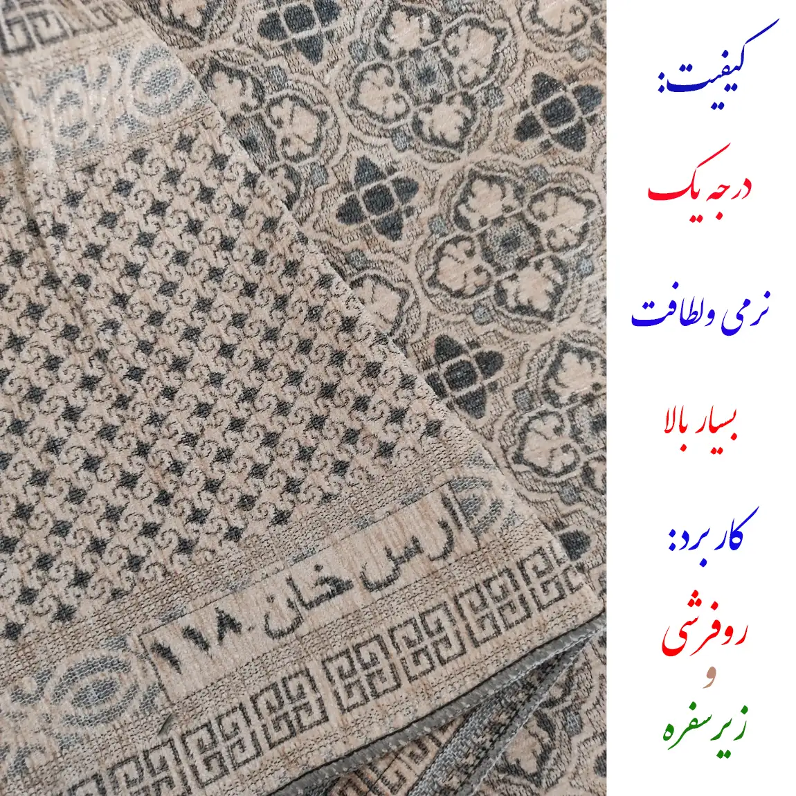 روفرشی و زیرسفره مخمل شانل تراکم بالا با جنس و بافت درجه یک و نرم و لطیف عالی محصولی از ذوق و هنر و مهارت بافت یزدی ها که تونستند روفرشی هایی با طرح های اینچنینی رو از طریق بافت ( و نه چاپ) تولید کنند. باید به چنین مهارت هایی آفرین گفت. بافت روفرشی به شکلی است که بی شک با دیدن آن از نزدیک و لمس آن محو این هنر خواهید شد. می توانید از هر دو سمت این روفرشی استفاده کنید.