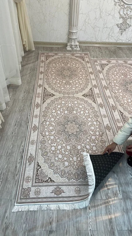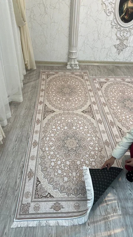 فرشینه استپ دار یک محصول جدیدی است که چند سالی است به عنوان جایگزین ارزان قیمت تر فرش تولید میشود. این محصول از یک لایه پارچه ای از جنس مخمل شانل تشکیل شده است که طرح روی این لایه چاپ می شود. لایه میانی یک لایه از نمد است و لایه زیرین یک لایه استپ دار است. به دلیل این لایه روی سرامیک حرکت خاصی نخواهد داشت. این محصول را راحت می توان به مانند فرش به قالی شویی داد. این محصول از ابعاد پادری تا ۱۲ متری تولید میشود. با توجه به سایزهای متنوع و تعداد طرح بسیار زیاد، این محصول با سفارش تولید میشود. هر سایزی که نیاز داشته باشید هم تولید میشود. حتی اگر ۱۵۴ در ۳۴۷ که دقیق هم نیست تولید میشود. برای این سایزهایی که در منوی سایزها موجود نیست، از چت سایت با ما در تماس باشید. قول ما برای زمان تولید و ارسال ۲۵ روز کاری است و هزینه ارسال طبق قانون کارگاه بر عهده مشتری است. لازم به ذکر است از هر طرح فرشینه، کاور فرش کشدار نیز قابل سفارش است و از هر طرح کاور فرش کشدار، فرشینه نیز قابل سفارش است.