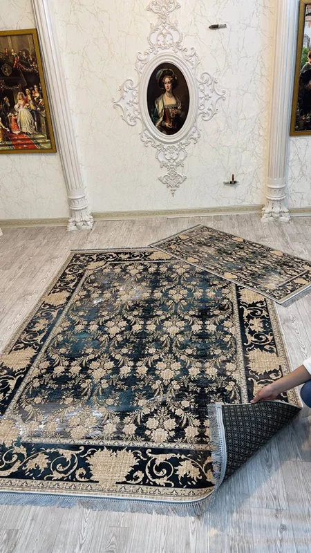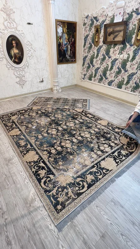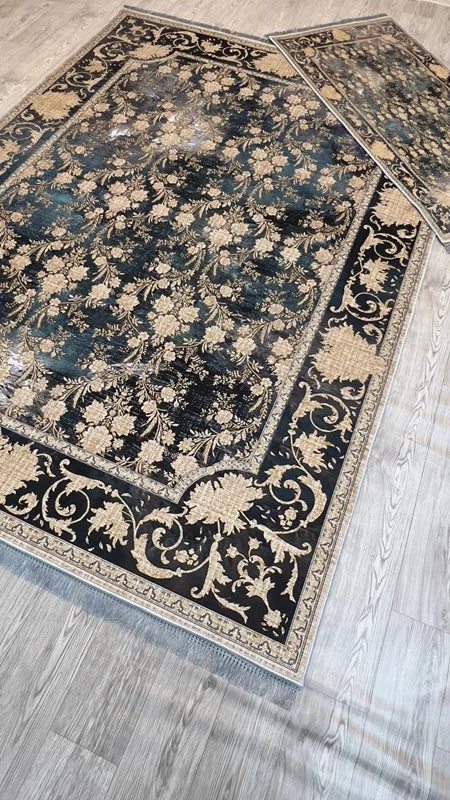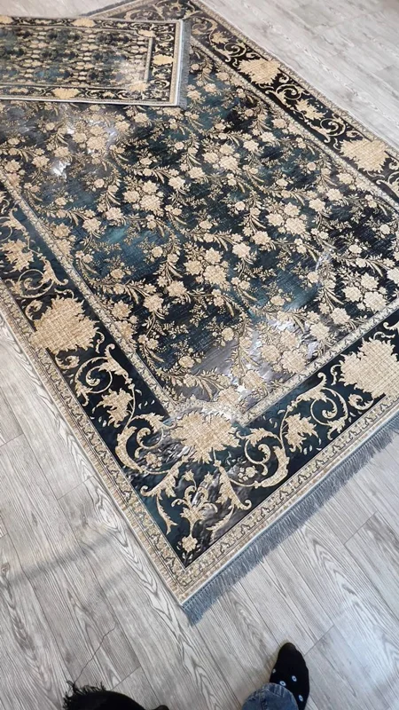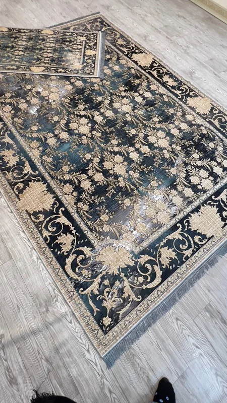 فرشینه استپ دار ۳ لایه ریشه دار (فرش لایت) کیفیت عالی با طرح فوق العاده رنگ سبز سلطنتی ترکیب کرم طلایی و مشکی کد fh1960 (با فیلم)