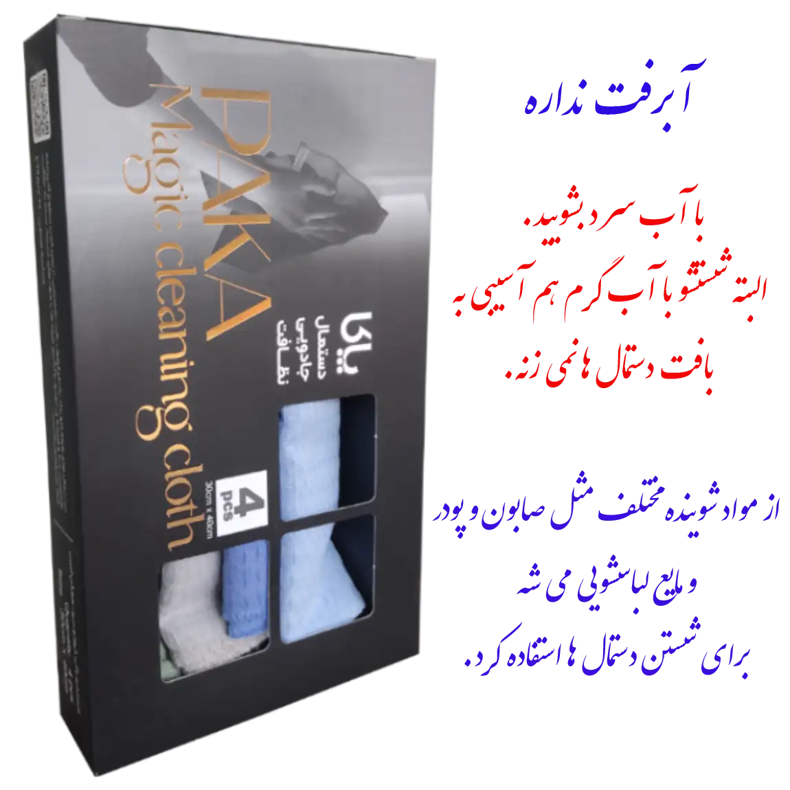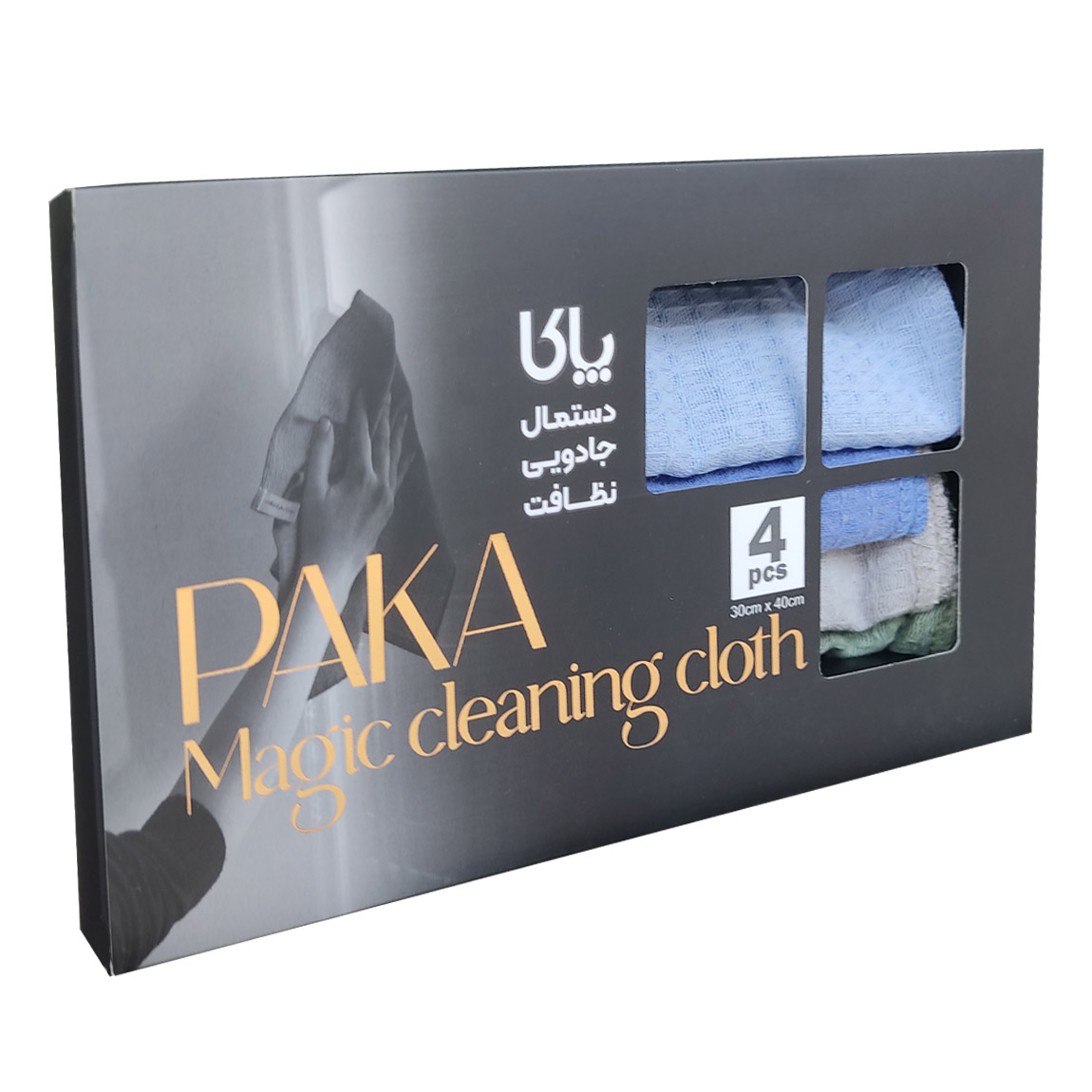 دستمال های همه کاره پاکا به خاطر فرمول بافت تخصصی (تولید اصفهان)، در تمیز کردن سطوح آشپزخانه و بدنه و شیشه خودرو یا آبگیری میوه و ظروف شسته شده کاربرد دارد. این دستمال با سایز تقریبی 30*40 سانتیمتر (با مقداری تلرانس تولید) دارای سایزی کاربردی اند. در هر بسته 4 عدد دستمال همه کاره پاکا وجود دارد. این دستمال ها اگر چه بهتر است با آب سرد شسته شود ولی می توان آنها را با آب گرم هم شست. آبرفت ندارد و مواد شوینده مختلف را میتوان برای شستشوی آنها استفاده کرد. ولی اگر میخواهید رنگشان ثابت بماند، از مواد رنگ بر مثل وایتکس به همراه این دستمال ها استفاده نکنید. بسته بندی شیک این محصول باعث می شود حتی به عنوان هدیه به دیگران بدهید.