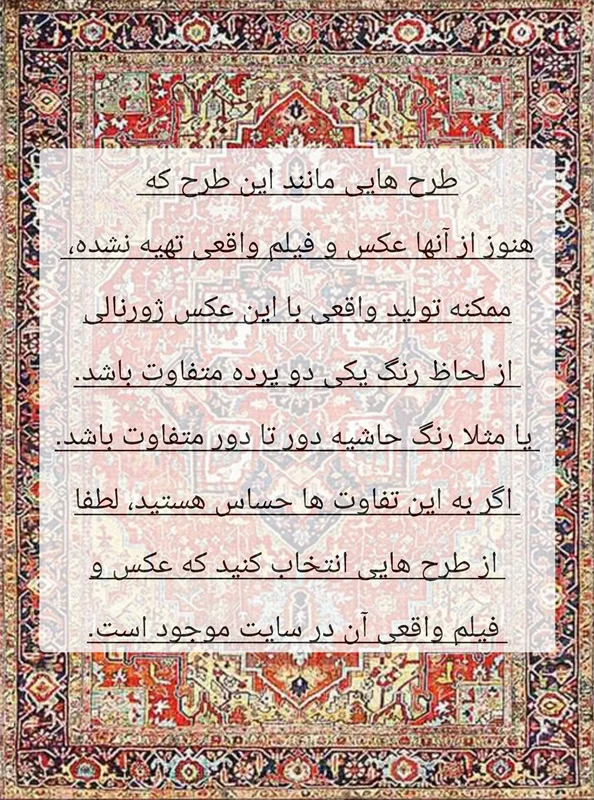 این روفرشی کشدار (کاور روفرشی) با بهترین کیفیت موجود در بازار و با بهترین پارچه دو رو مخمل شانل و با تراکم خیلی بالا و کیفیت چاپ فوق العاده (کاملا مانند عکس ژورنالی) با طرح بسیار زیبا در سایزهای 4 و 6 و 9 و 12 متری تولید می شود. در صورتی که فرش شما نسبت به اندازه های استاندارد کمی بزرگتر یا کوچکتر باشند، می توانید در قبال 100 هزار تومان بیشتر، سایزهای غیر استاندارد نیز سفارش دهید. قول ما برای مدت زمان مورد نیاز برای تولید این کاور فرش از روز ثبت سفارش، ۲۵ روز کاری می باشد، اما عموما زودتر تولید و ارسال می شود. ما برای این بدقول نشیم، قول ۲۵ روز کاری را میدهیم. کاورهای فرش به دلیل دریافت سفارش برای تولید، به صورت پرداخت کامل در موقع سفارش است و هزینه ارسال به صورت هماهنگ کشوری بر عهده مشتری به صورت پس کرایه می باشد. در صورت انتخاب سایز غیر استاندارد، در قسمت توضیحات سفارش (مستطیلی که بعد از ثبت آدرس و زیر نقشه محل سکونت قرار دارد که در حین سفارش آن را خواهید دید)، سایز دقیق فرشتان را بنویسید تا دقیقا متناسب با سایز فرشتان تولید شود. فکر نکنید فرش شما استاندارد است. اکثر فرش ها چند سانت کوچیک بزرگ اند. در تولید کاور فرش حتی یک سانت هم مهم است. پس سعی کنید در اندازه فرشتان از متر فلزی استفاده کنید. عرض که مشخص است چطور اندازه بگیرید. برای اندازه گیری طول ریشه حساب نشود ولی بافت سفید قبل از ریشه باید در اندازه گیری طول، لحاظ شود. لطفا همچنین در توضیحات سفارش ذکر کنید فرشتون چند شانه است و چه تراکم بافتی دارد. این اطلاعات گاهی برای نوع کش دوزی و میزان اضافه پارچه مورد نیاز، مورد نیاز خیاط است و عموما در لیبلی در زیر فرشتان درج شده است و میتوانید لبه فرشتون را بالا بزنید و ببینید.